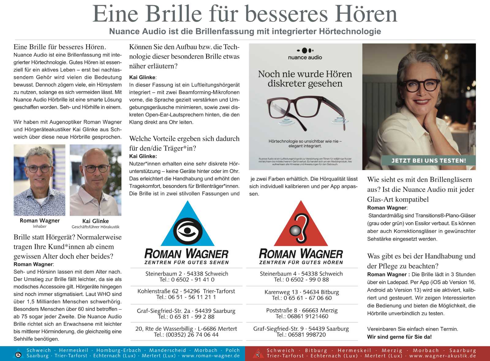 In ausgewählten Zentren für gutes Sehen und Hören von Roman Wagner zeigen wir Ihnen die Bedienung der Nuance Audio und bieten die Möglichkeit die Hörbrille unverbindlich zu testen.